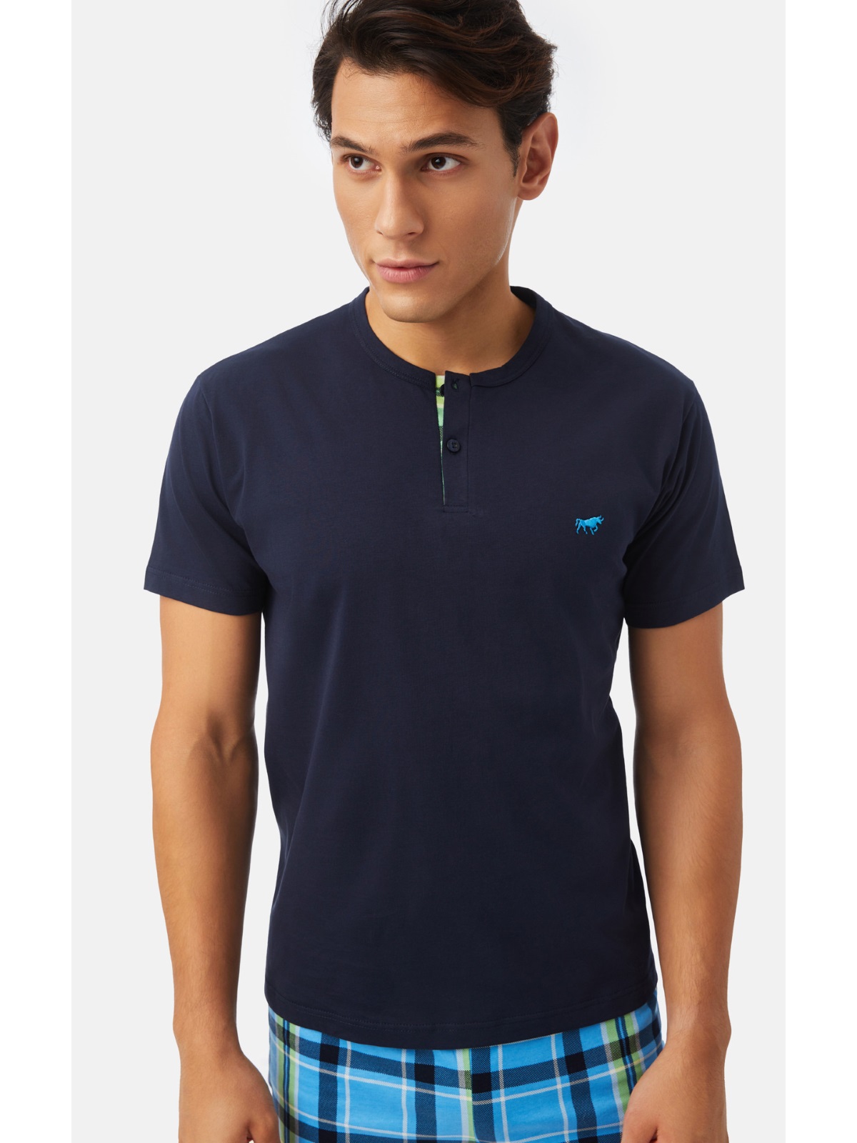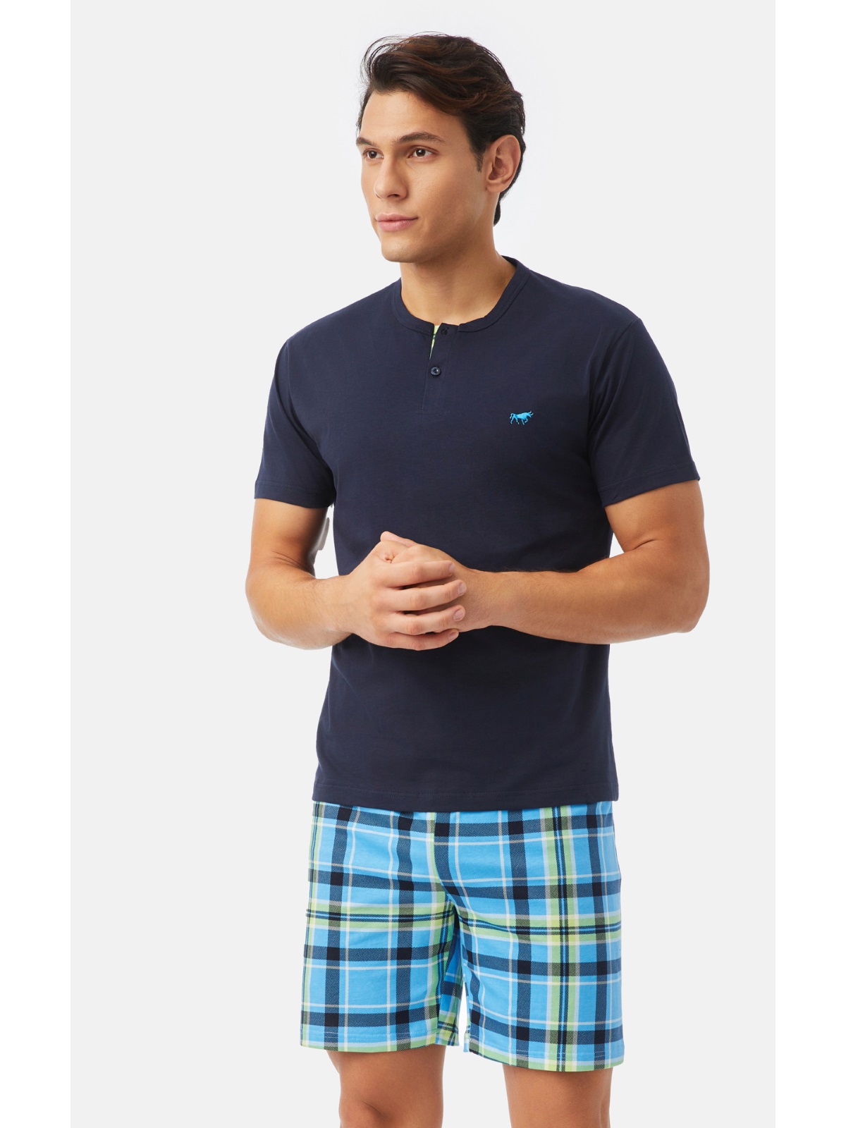 Σετ πυζάμας από 100% βαμβάκι, εξαιρετικής ποιότητας. Το σετ αποτελείται από τοπ κοντομάνικο με πατιλέτα και κουμπιά, κέντημα στο στήθος και καρό ψηλοκάβαλο σόρτς.