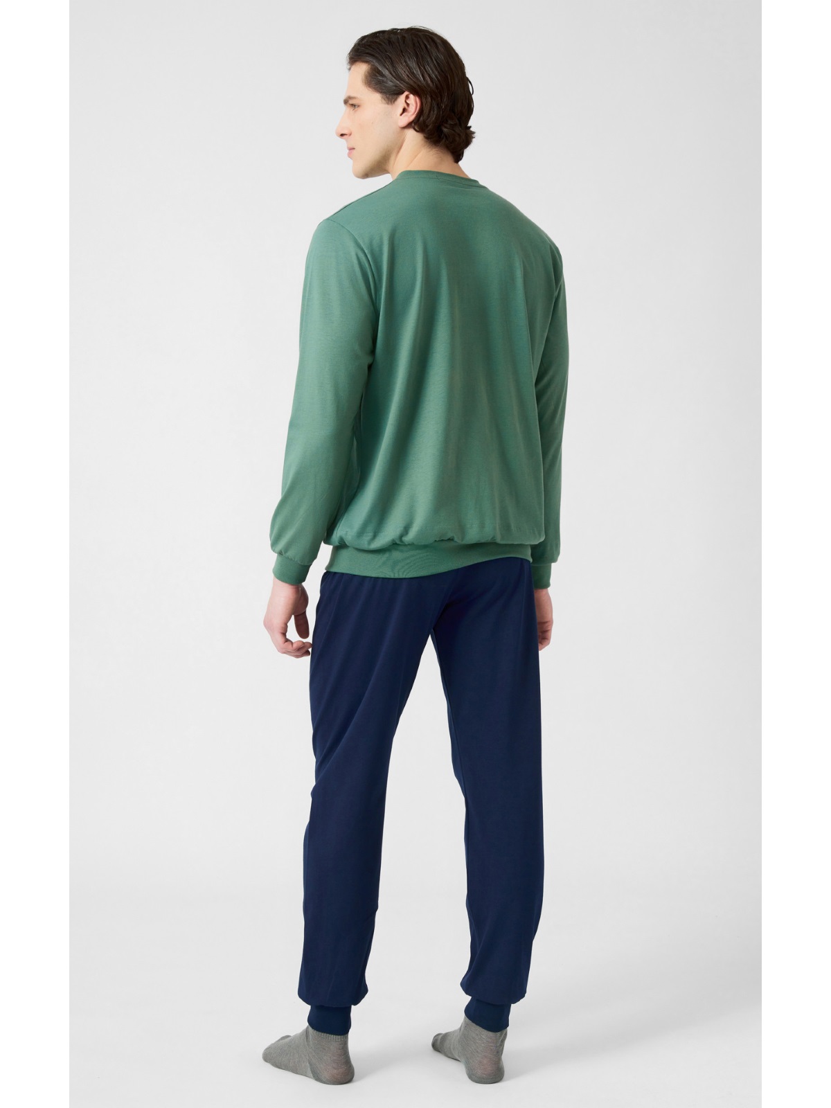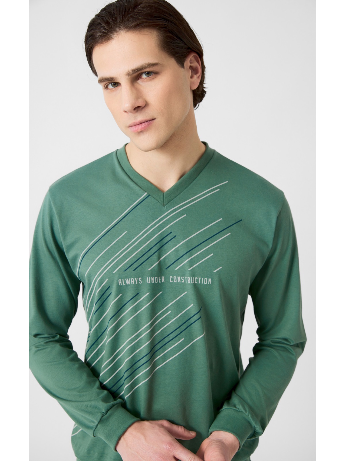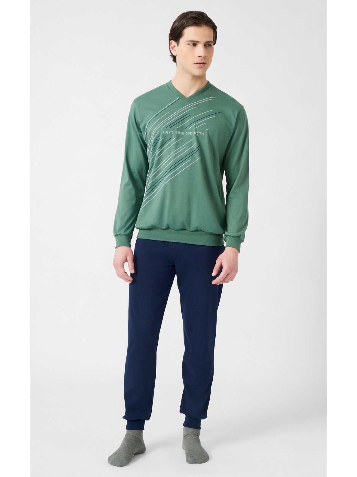 Χειμερινή πυζάμα από 100% βαμβακερό ύφασμα, υψηλής ποιότητος. Το σετ περιλαμβάνει μπλούζα με V λαιμόκοψη και τύπωμα και παντελόνι με μπάσκες στο τελείωμα.
