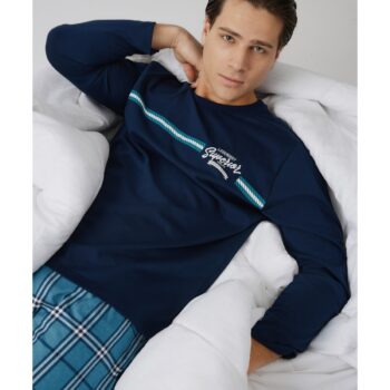 Χειμερινή πυζάμα από 100% βαμβακερό ύφασμα, υψηλής ποιότητας. Το σετ περιλαμβάνει μπλούζα με στρογγυλή λαιμόκοψη, τύπωμα στο στήθος και τυπωμένο καρό παντελόνι με μπάσκες στα τελειώματα.
