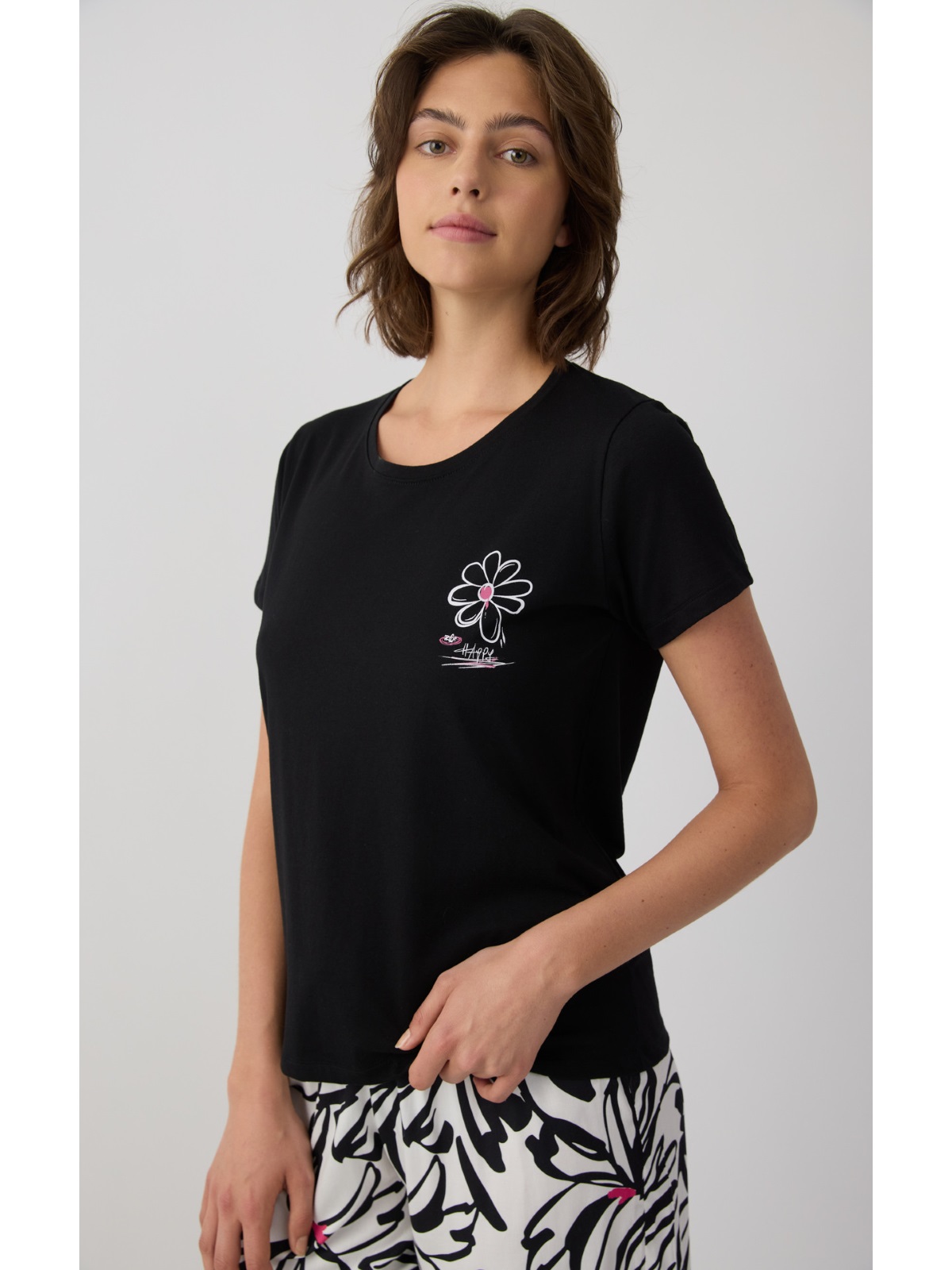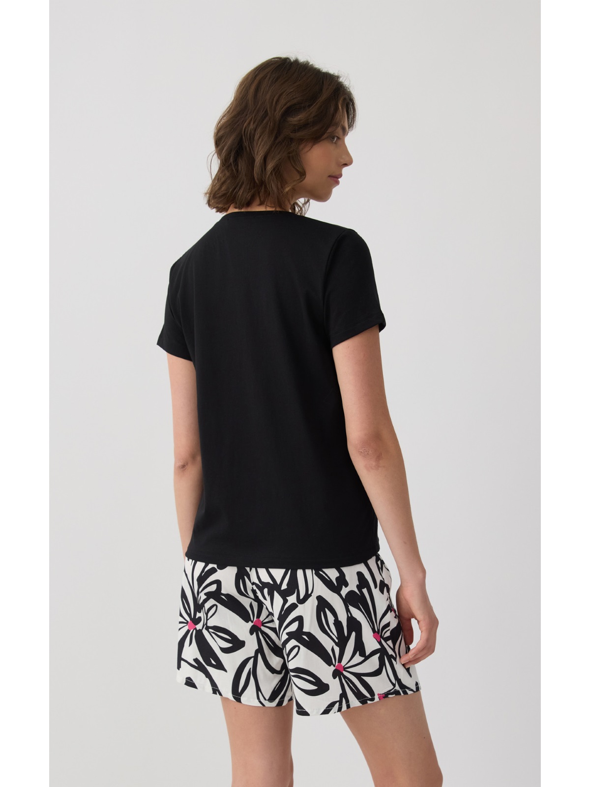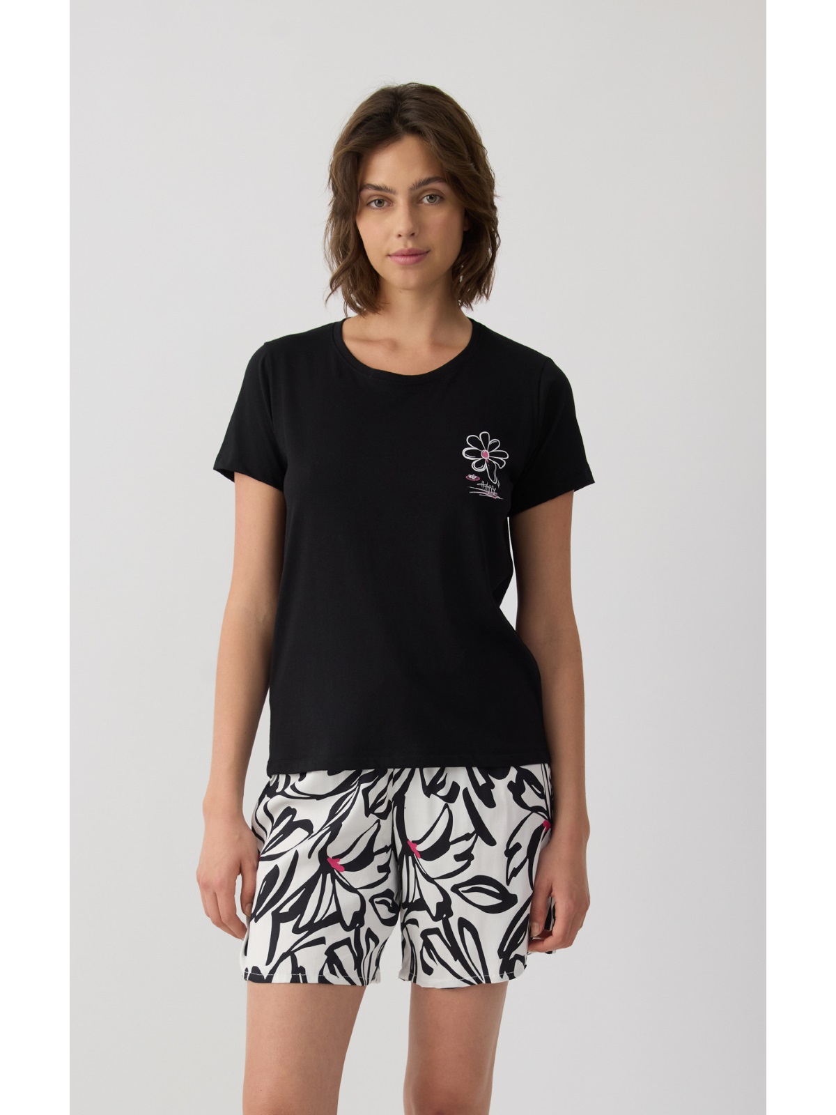 Σετ πυτζάμας που συνδυάζει άνεση και κομψό στυλ. Το σετ αποτελείται από κοντομάνικο T-shirt με διακριτικό διακοσμητικό τύπωμα στο στήθος, κατασκευασμένο από ύφασμα με σύνθεση 50% βαμβάκι και 50% TENCEL™ που προσφέρει εξαιρετική απαλότητα και φυσική διαπνοή. Συνδυάζεται με κοντό σορτς από 100% viscose satin με floral τύπωμα, ελαστική μέση και κορδόνι για άνετη και ρυθμιζόμενη εφαρμογή.