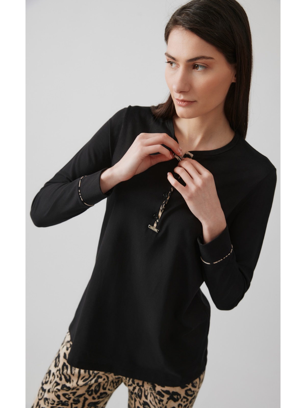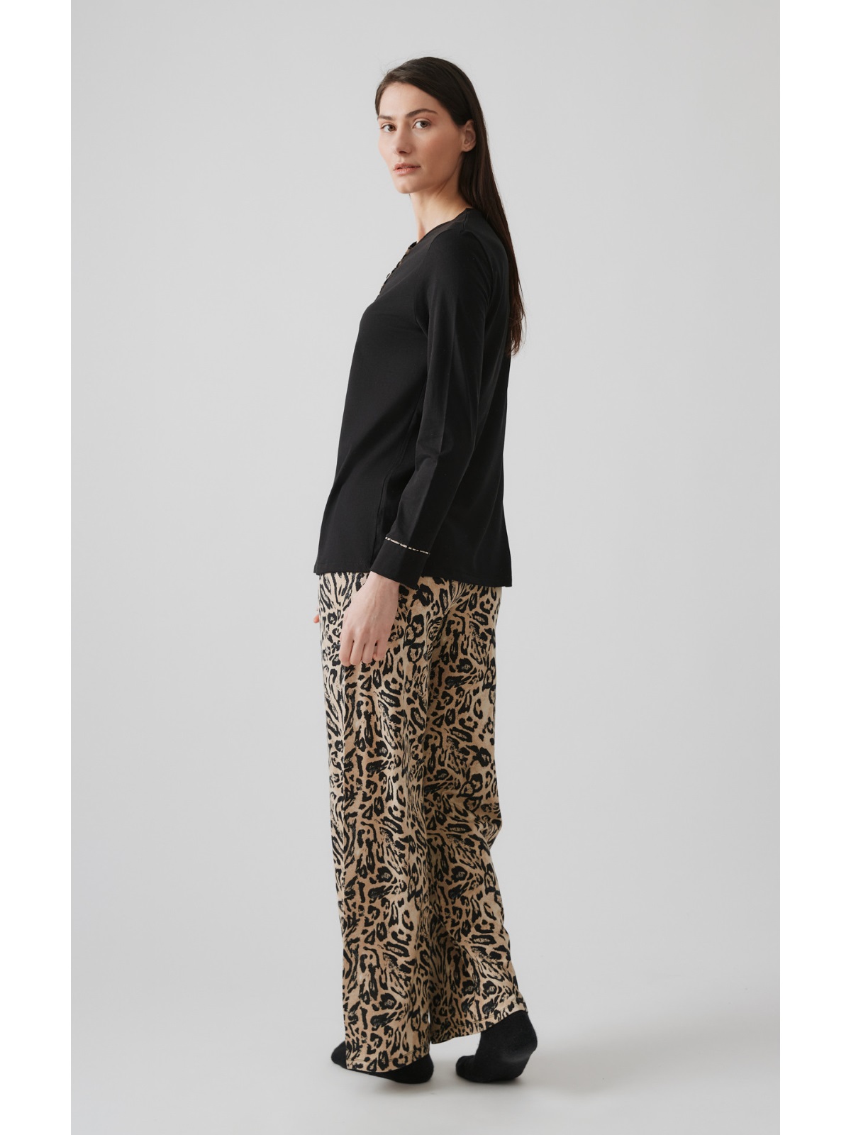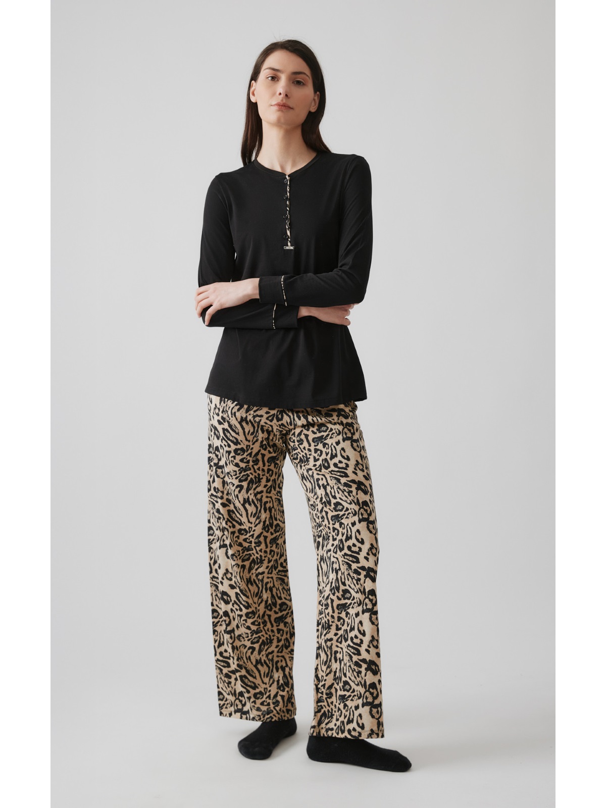 Χειμερινή πυζάμα από 50% TENCEL™ Modal & 50% βαμβάκι υψηλής ποιότητας. Η μίξη αυτών των δύο φυσικών ινών προσδίδει ένα εξαιρετικό αποτέλεσμα, ιδανικό για πυζάμες και άνετα ρούχα. Το σετ περιλαμβάνει μακρυμάνικη, μονόχρωμη μπλούζα με πατιλετα και κουμπιά με κοντράστ εμπριμέ ρέλι και παντελόνι μακρύ τυπωμένο all over.