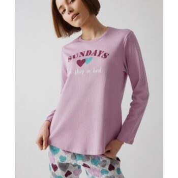 Xειμερινή πυζάμα από 100% βαμβάκι ιντερλοκ, υψηλής ποιότητας. Το σετ περιλαμβάνει μπλούζα μακριμάνικη μονόχρωμη, με τύπωμα στο στήθος και παντελόνι τυπωμένο με μπάσκες στα τελειώματα.