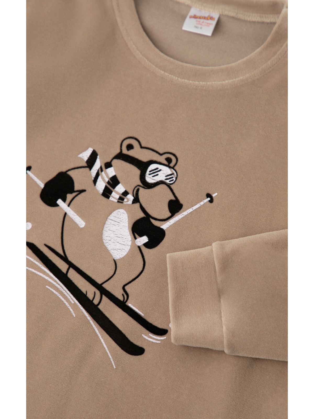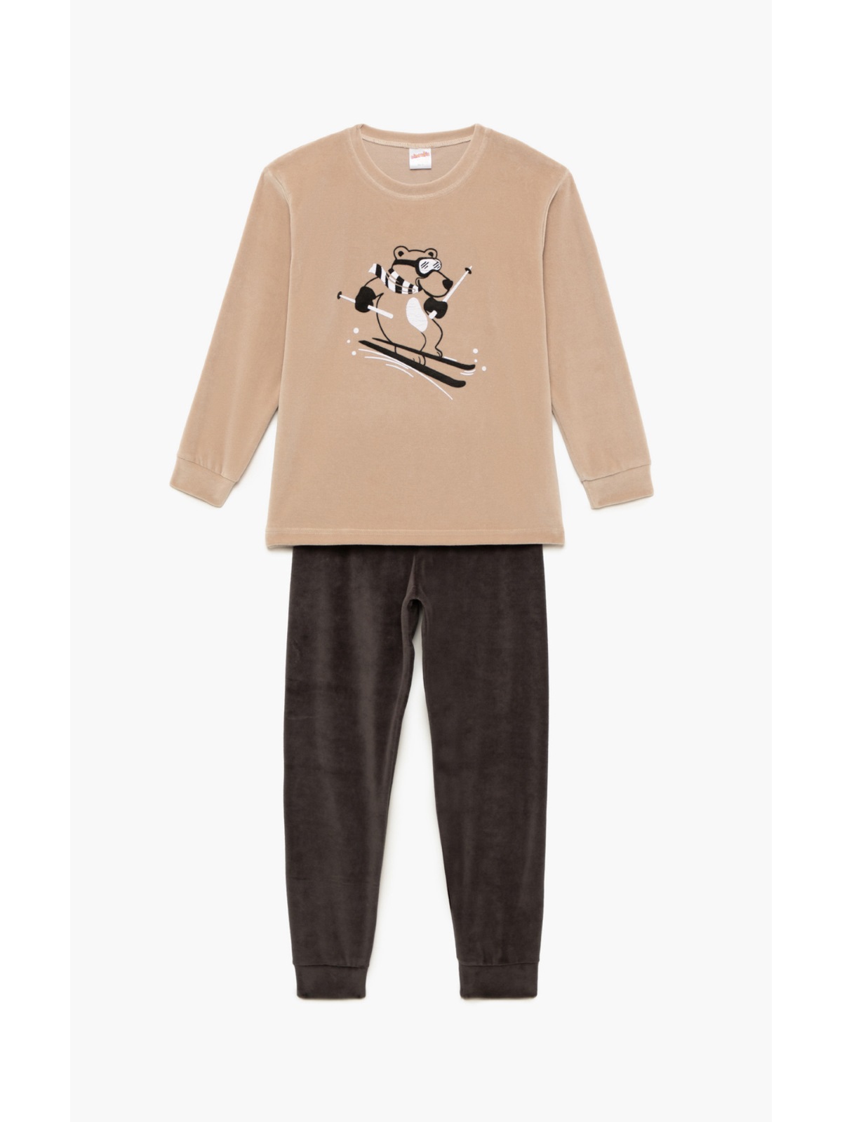 Παιδική βελούδινη χειμερινή πιζάμα, από 80% βαμβάκι & 20% polyester. To σετ, περιλαμβάνει μπλούζα με τύπωμα στο στήθος και παντελόνι με μπάσκες στα τελειώματα.
