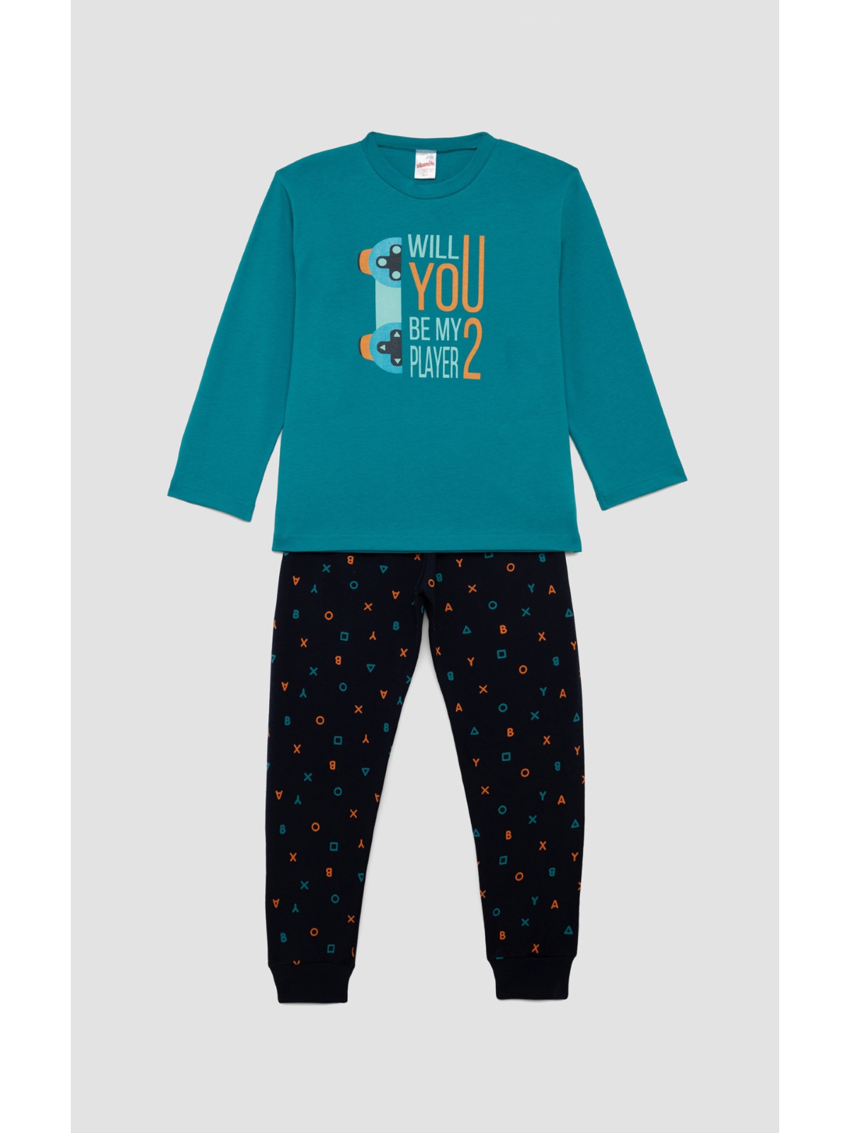 Παιδική χειμερινή πυζάμα, από 100% βαμβάκι υψηλής ποιότητας, με συνδυασμούς τύπωμα all over και μονόχρωμο. Το σετ περιλαμβάνει μπλούζα με έξτρα τύπωμα στο στήθος και παντελόνι με μπάσκες στα τελειώματα.